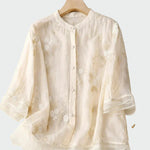 Η μπλούζα εκρού με διακριτικά λουλουδάτα κεντήματα είναι ένα κομψό και αέρινο κομμάτι που αποπνέει θηλυκότητα και απλότητα. Με κουμπιά στο μπροστινό μέρος και μανίκια 3/4, προσφέρει άνεση και στυλ για κάθε περίσταση.