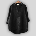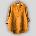 Elegant linen blouse in pure that exudes freshness and timeless style. It features a V-neckline with a discreet placket, long sleeves that can be rolled up and an asymmetrical finish with a longer back, offering comfort and ease of movement. An ideal choice for cool summer looks or an elegant casual look.