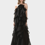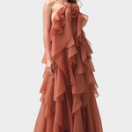 Αυτό το υπέροχο μακρύ φόρεμα σε ζεστή καστανοκόκκινη απόχρωση αποπνέει πολυτέλεια και ρομαντισμό. Σχεδιασμένο με πολυεπίπεδα βολάν από ανάλαφρο και αέρινο ύφασμα, δημιουργεί εντυπωσιακή κίνηση σε κάθε σας βήμα.