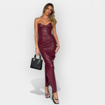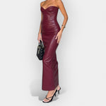 Αυτό το φόρεμα ξεχωρίζει με τον τολμηρό του χαρακτήρα και την πολυτελή υφή του δέρματος. Ιδανικό για εμφανίσεις με άποψη, συνδυάζει κομψότητα και δυναμισμό σε κάθε του γραμμή.