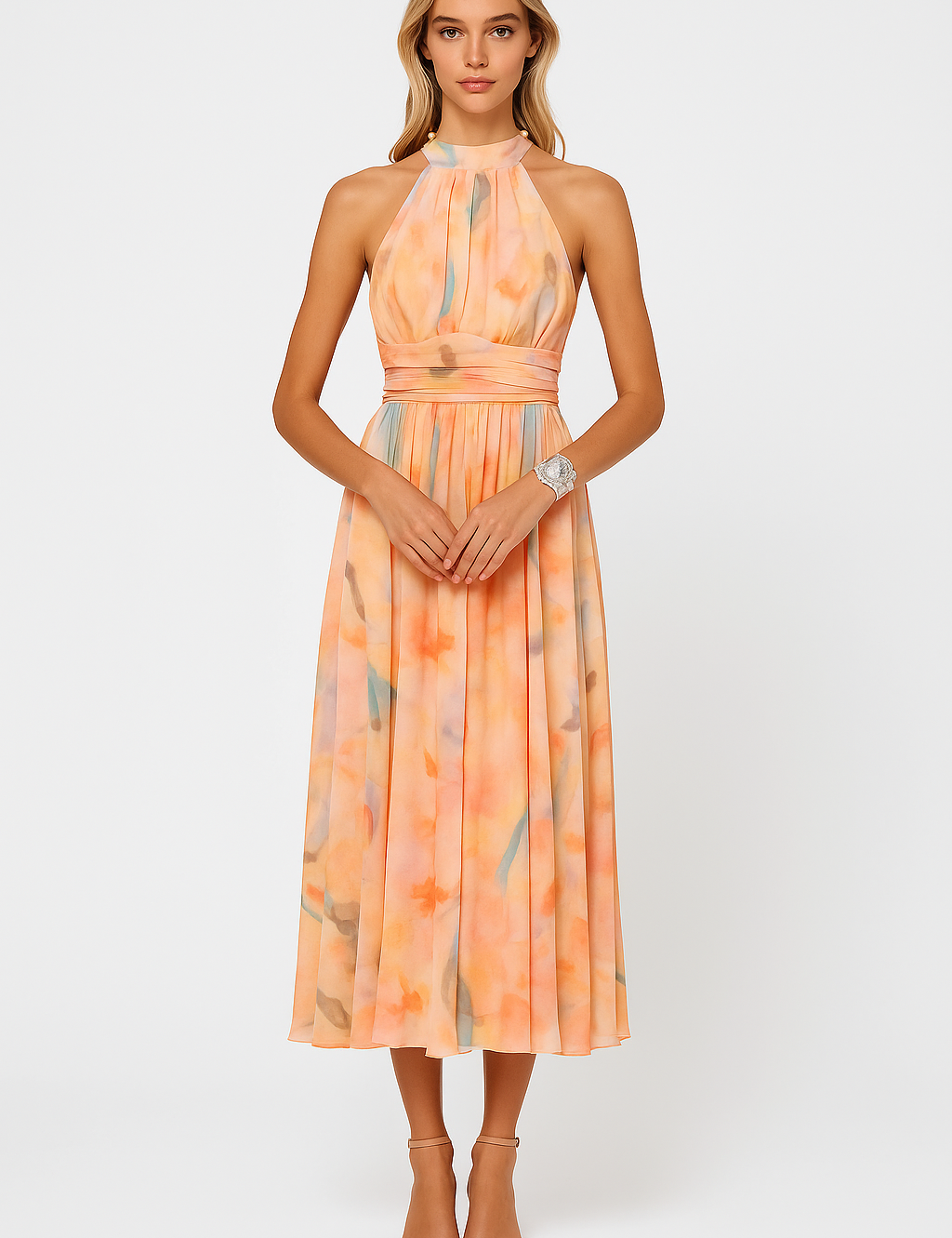 Μακρύ Φόρεμα με Δέσιμο στον Λαιμό και Σατινέ Υφή