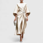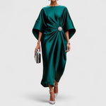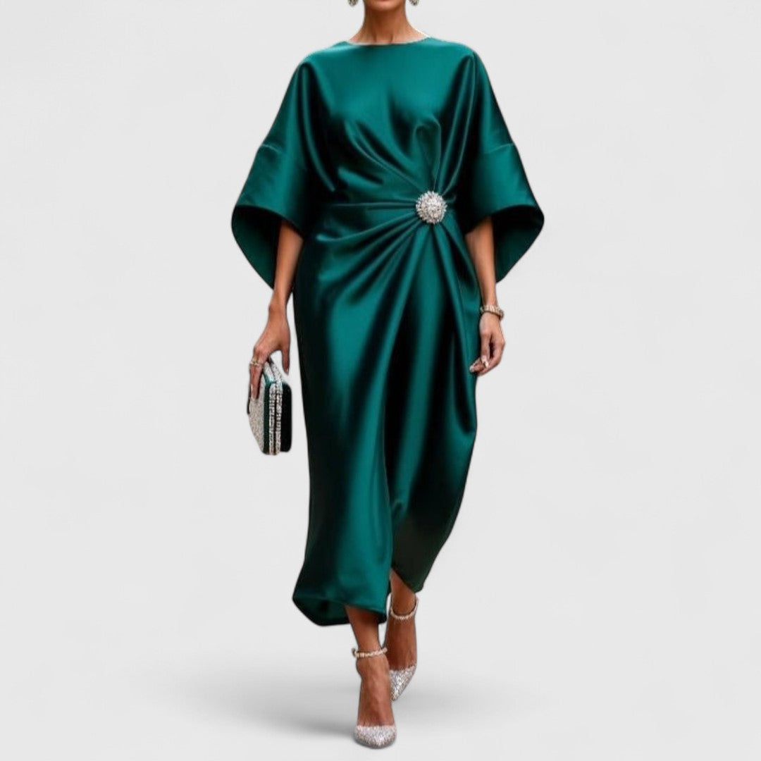 • Κορμάκι που κολακεύει και ντραπέ φούστα για ισορροπημένο, κομψό σχήμα.