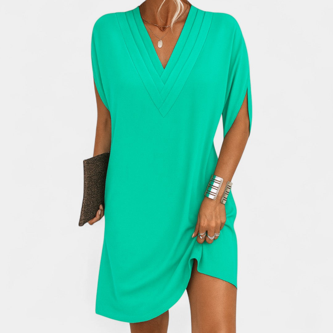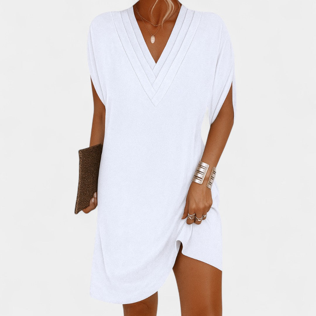 • Κολακευτική γραμμή: ευθύ κόψιμο και V ντεκολτέ που επιμηκύνει και οπτικά αδυνατίζει τη σιλουέτα.