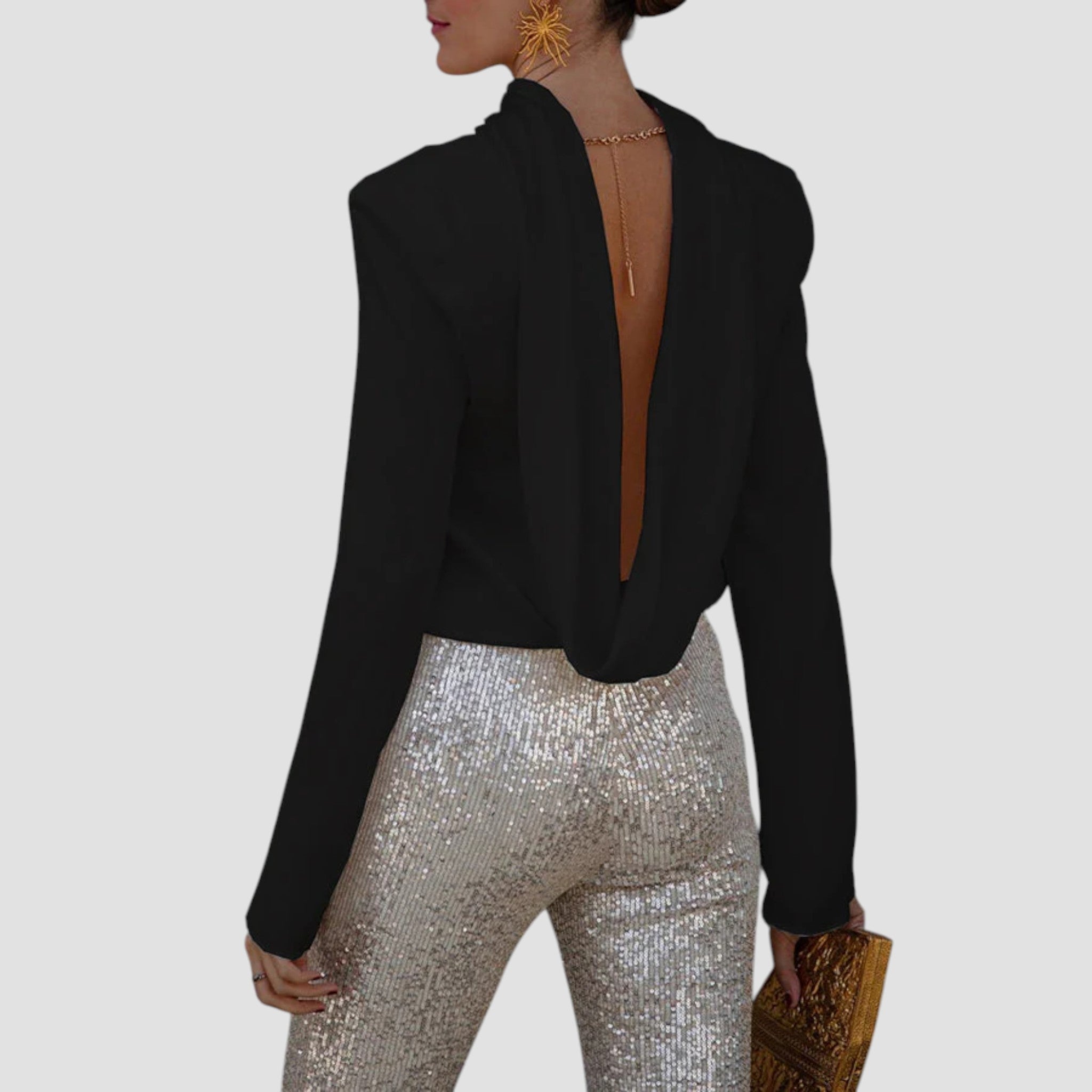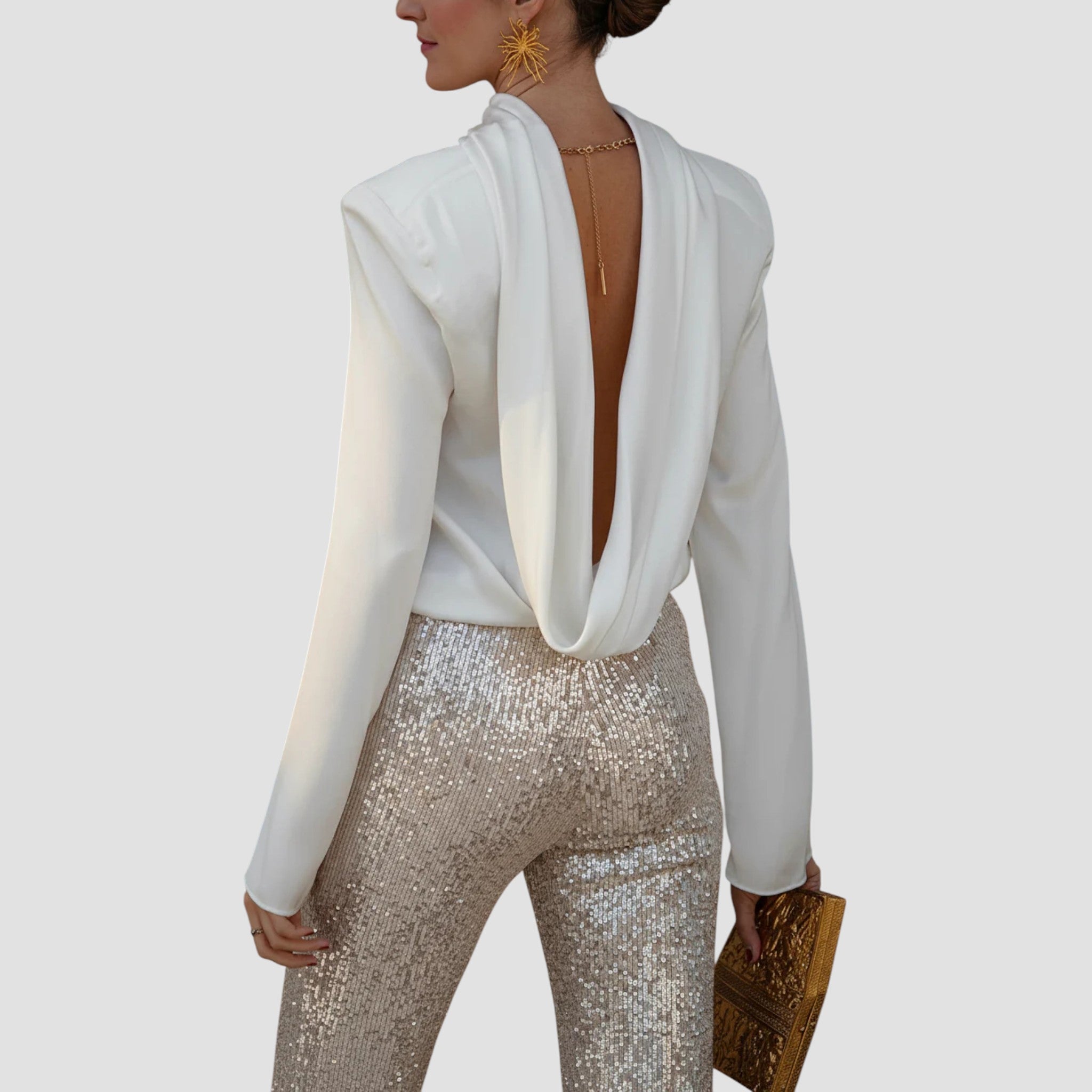 Τελειοποιήστε την τέχνη της "εισόδου" — αλλά και της "εξόδου" — με αυτή την εξαιρετική σατινέ μπλούζα. Από μπροστά, ο σοφιστικέ ψηλός γιακάς (mock-neck) και οι δομημένοι ώμοι προσφέρουν μια εικόνα διαχρονικής και αυστηρής κομψότητας. Ωστόσο, η πραγματική μαγεία κρύβεται στην πλάτη, όπου το δραματικό, ντραπέ άνοιγμα αποκαλύπτει ακριβώς όσο δέρμα χρειάζεται για μια ακαταμάχητη πινελιά αισθησιασμού. Είτε επιλέξετε το λευκό, το κόκκινο ή το μαύρο, αυτό το τοπ έχει σχεδιαστεί για να πέφτει ανάλαφρα στη σιλουέτα σας, αποτελώντας το ιδανικό "statement" κομμάτι για το επόμενο εορταστικό πάρτι ή μια επίσημη βραδινή έξοδο.
